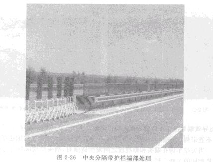 標(biāo)準(zhǔn)路段采用分設(shè)型波形梁護(hù)欄時(shí),其圓形端頭及過(guò)渡段線形應(yīng)與中央分隔帶相一致,立柱間距為2m;標(biāo)準(zhǔn)路段采用組合獄波形梁護(hù)欄時(shí),可以四形端頭開(kāi)始或結(jié)束〔圖2一25)。圖2一26中是優(yōu)化過(guò)的中央分隔帶護(hù)欄的端部,能起到警示作用。